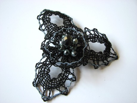 Paličkovaná technika, materiál - nerezový drátek omotaný hedvábnou nití, průměr 9cm. Výrobek působí křehce, přesto dokonale drží tvar. Je vhodný jako doplněk na klopu saka, svetříky, šaty, nebo klobouky. Cena 590,-Kč vč. dárkové krabičky + poštovné