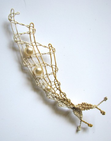 Paličkovaná technika, materiál - nerezový drátek omotaný hedvábnou nití, velikost 11x3cm. Výrobek působí křehce, přesto dokonale drží tvar. Je vhodný jako doplněk na klopu saka, svetříky, šaty, nebo klobouky. Cena 330,-Kč vč. dárkové krabičky + poštovné